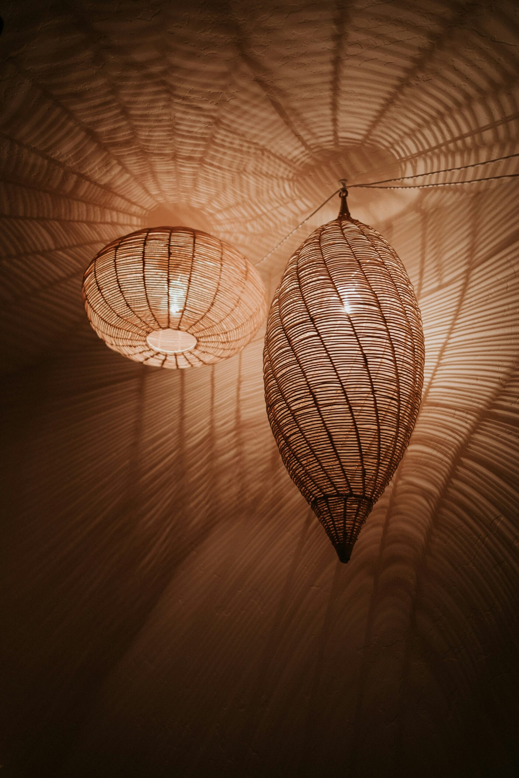 Uma luminária de fibra desenhando sombras artesanais