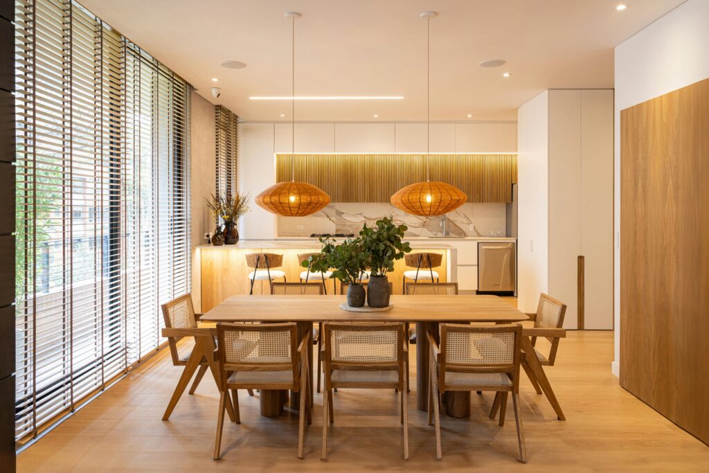 Jantar: pendente em fibra com difusor + mesa de madeira maciça + arranjo simples verde.